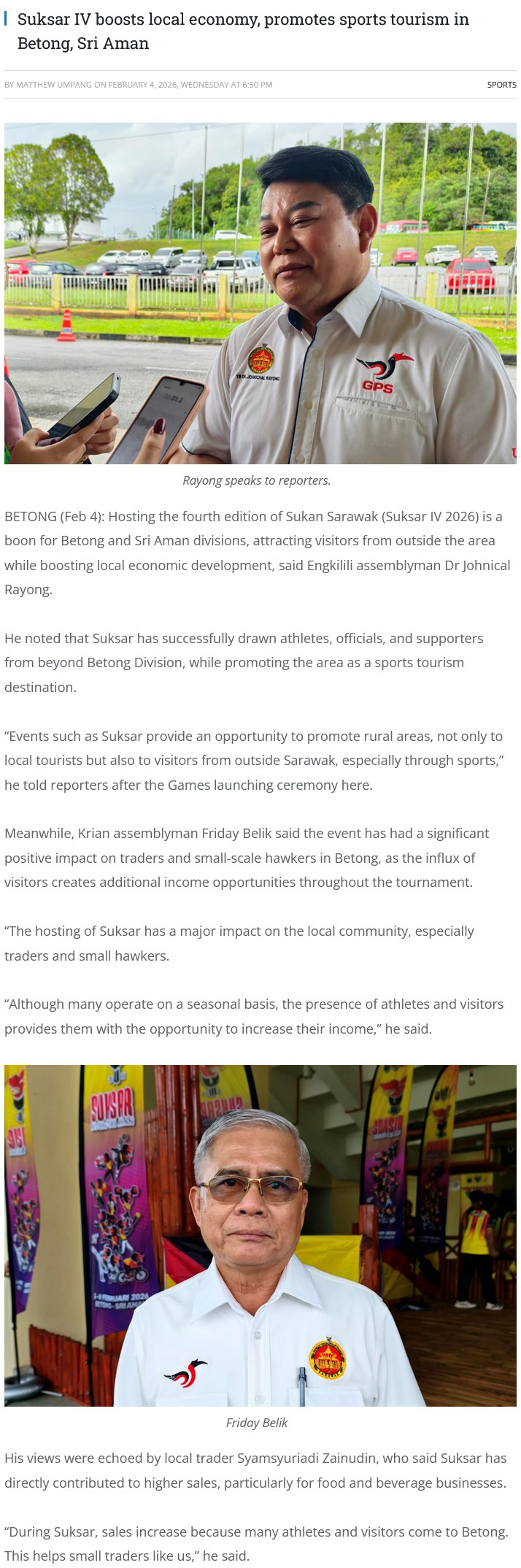 Source of News: https://www.theborneopost.com/2026/02/04/suksar-iv-boosts-local-economy-promotes-sports-tourism-in-betong-sri-aman/