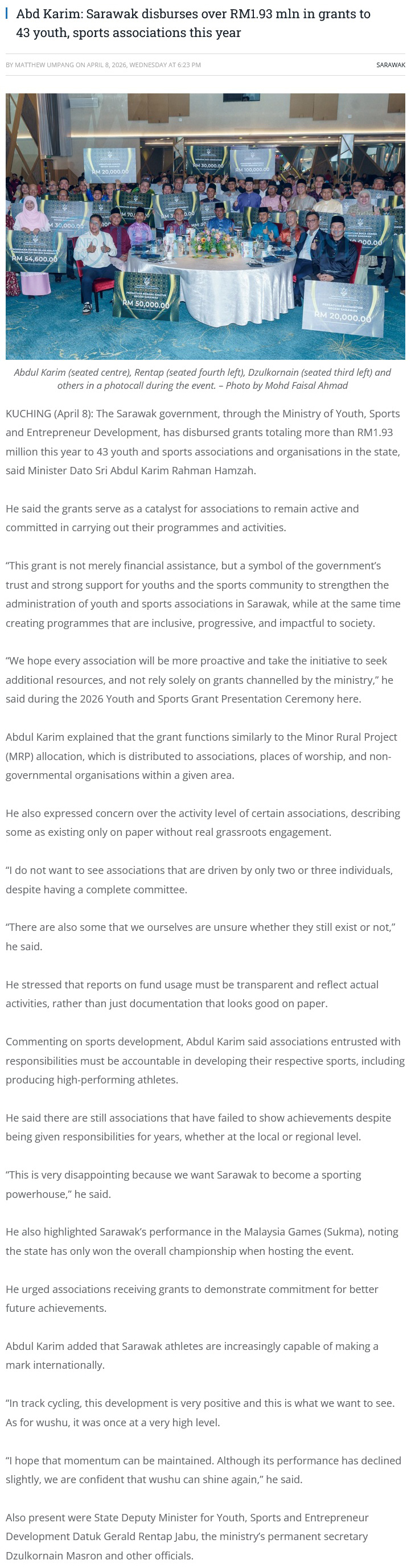 Source of News: https://www.theborneopost.com/2026/04/08/abd-karim-sarawak-disburses-over-rm1-93-mln-in-grants-to-43-youth-and-sports-associations-this-year/