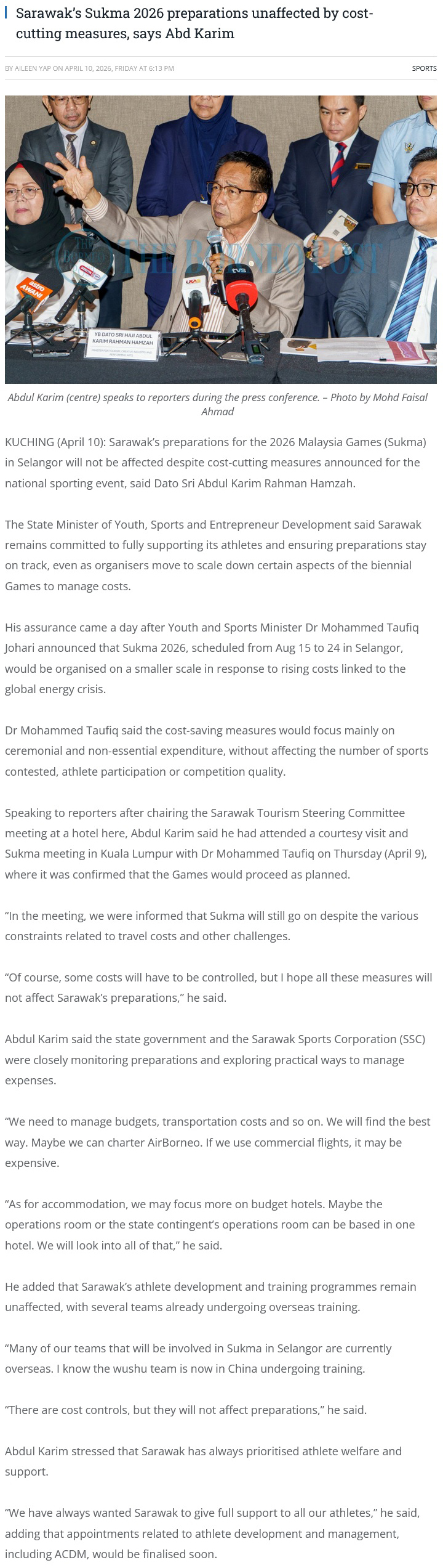Source of News: https://www.theborneopost.com/2026/04/10/sarawaks-sukma-2026-preparations-unaffected-by-cost-cutting-measures-says-abd-karim/