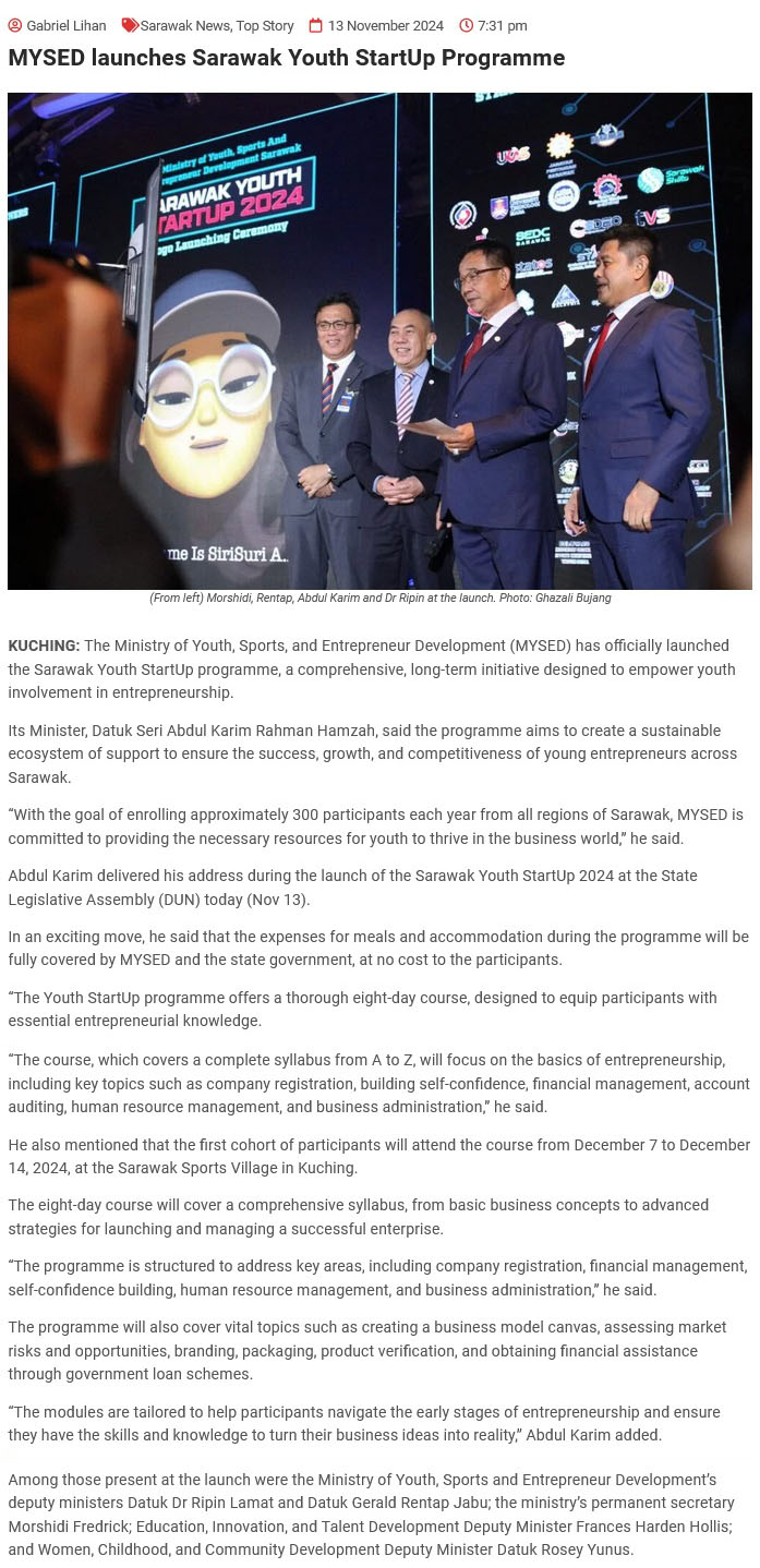 Source of News: https://www.newsarawaktribune.com.my/mysed-launches-sarawak-youth-startup-programme/