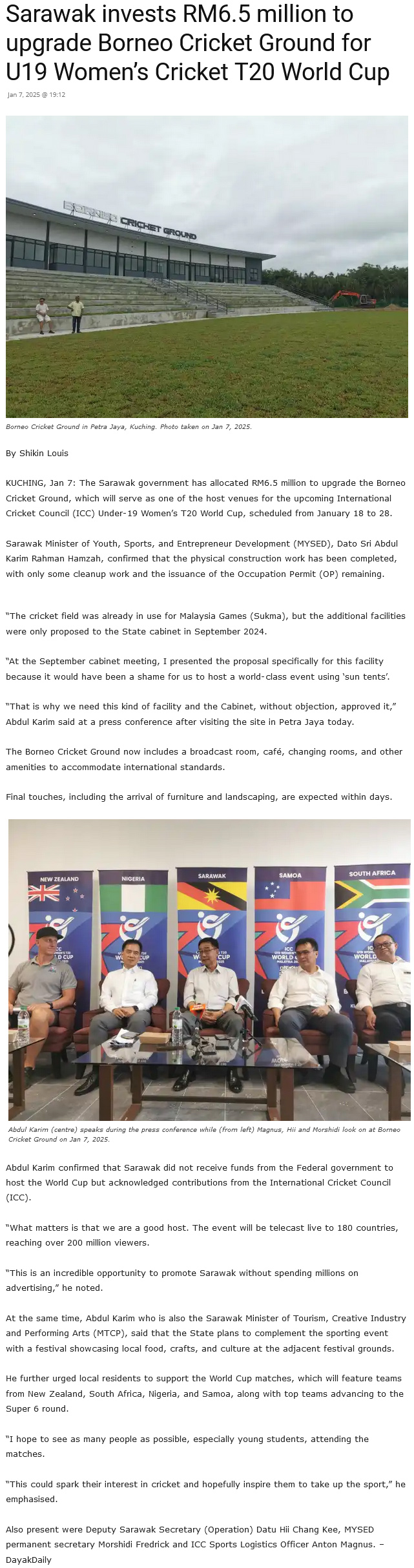 Source of News: https://dayakdaily.com/sarawak-invests-rm6-5-million-to-upgrade-borneo-cricket-ground-for-u19-womens-cricket-t20-world-cup/