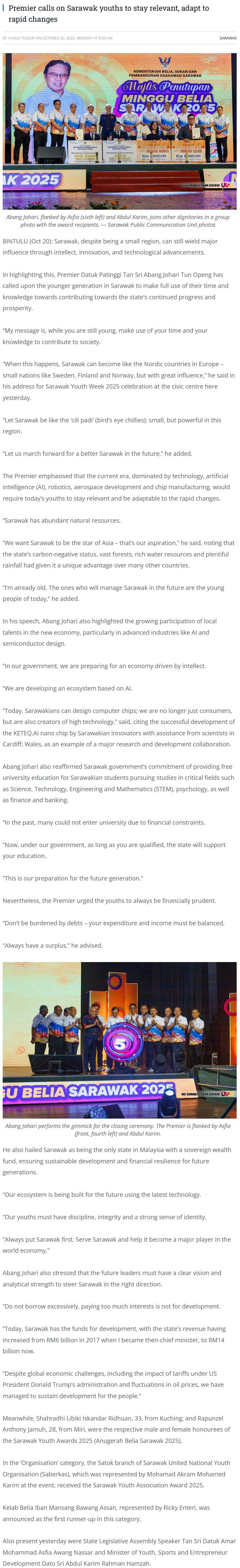 Source of News: https://www.theborneopost.com/2025/10/20/premier-calls-on-sarawak-youths-to-stay-relevant-adapt-to-rapid-changes/