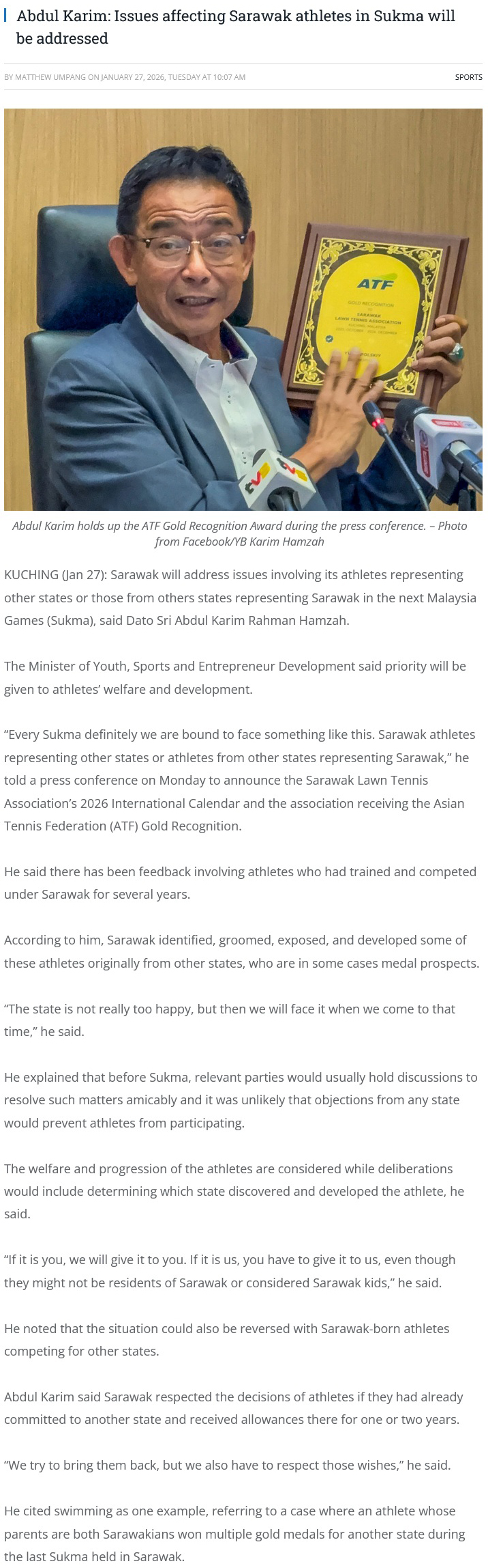 Source of News: https://www.theborneopost.com/2026/01/27/abdul-karim-issues-affecting-sarawak-athletes-in-sukma-will-be-addressed/